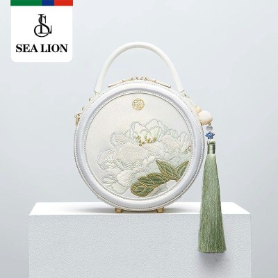 Brief:SEA LION2023新款映水芙蓉白色刺绣手提单肩斜挎小圆包包女包