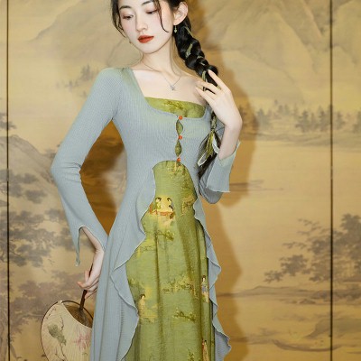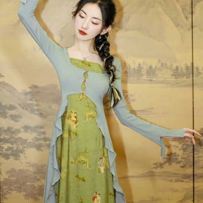 Brief:绿色古风仙女裙荷叶边连衣裙新中式国风裙春装裙子女设计感小众秋