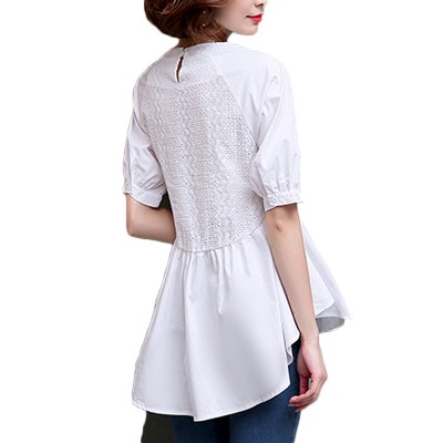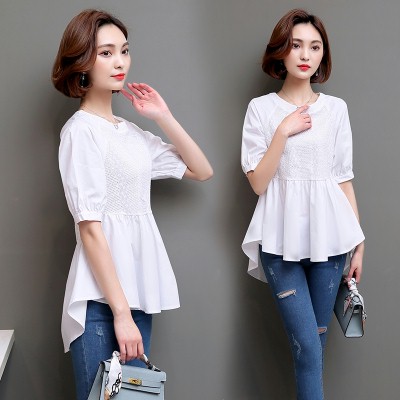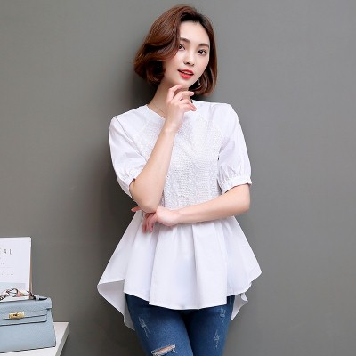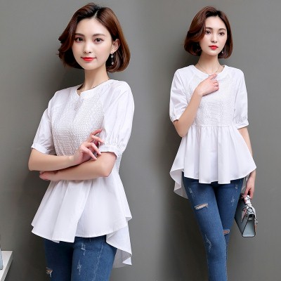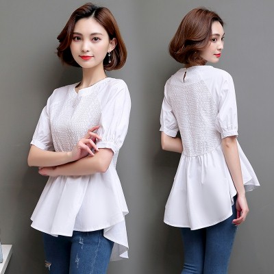 Brief:夏装前短后长白色衬衫女娃娃衫上衣收腰宽松短袖中长款百搭衬衣棉
