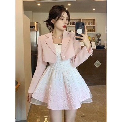 Brief:洋气减龄套装女秋季2023新款设计感小西服外套+渐变色吊带连衣裙