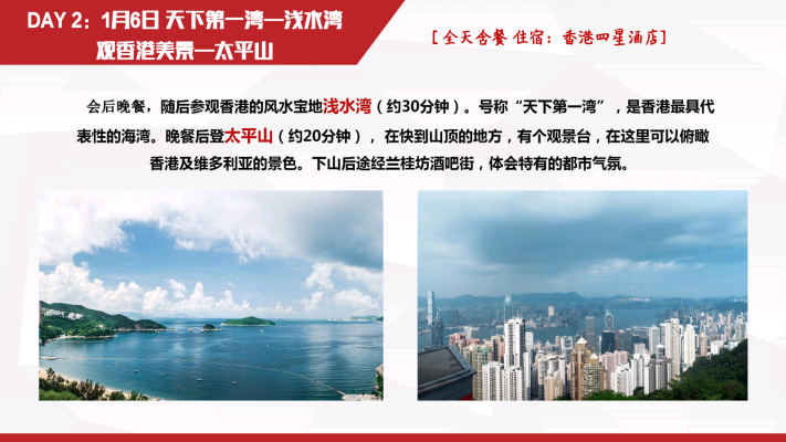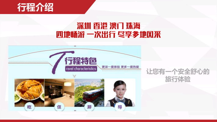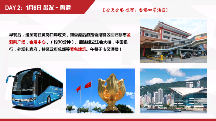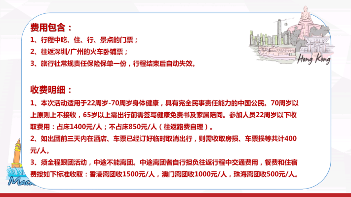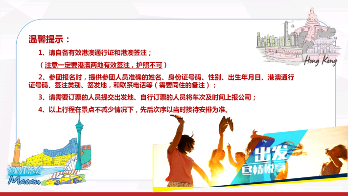 深港珠澳5日游团建活动 Zoom Name:ShenZhen Zavl Import & Export Co., Ltd Name:深港珠澳5日游团建活动 Model:ZW-2023省外-00018 Price:37人成人团¥2834.88/人,65岁以上长者团¥2786.35/人 Brief:深圳~香港(金紫荆广场~会展中心~立法会大楼~中国银行~外观礼宾府~特区政府总部~市区酒楼用餐~浅水湾~太平山~香港维多利亚港~兰桂坊~黄大仙~珠宝展示中心~国际手表店~百货免税店~国际免税商店DFS)~澳门(香港码头坐喷射式飞船~澳门酒店~大三巴牌坊~妈祖阁~主教山~望海观音~金莲花广场~金善美百货特产店~港澳国际免税店~威尼斯人酒店)~珠海渔女像~情侣路~金湾机场回各自温馨的家 Details
