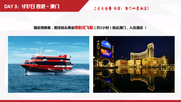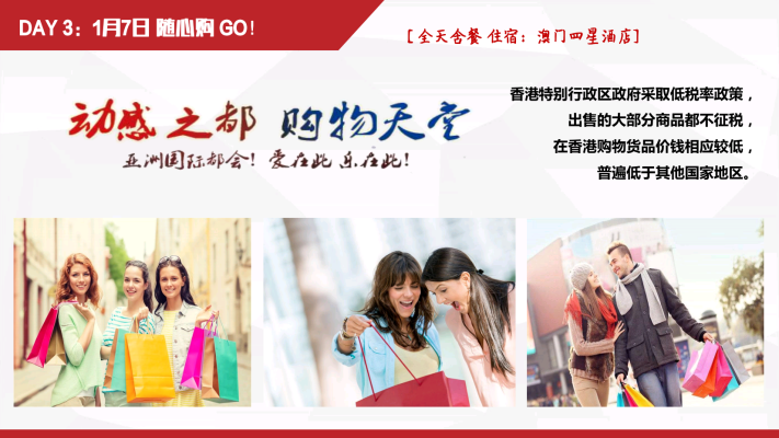 Brief:深圳~香港(金紫荆广场~会展中心~立法会大楼~中国银行~外观礼宾府~特区政府总部~市区酒楼用餐~浅水湾~太平山~香港维多利亚港~兰桂坊~黄大仙~珠宝展示中心~国际手表店~百货免税店~国际免税商店DFS)~澳门(香港码头坐喷射式飞船~澳门酒店~大三巴牌坊~妈祖阁~主教山~望海观音~金莲花广场~金善美百货特产店~港澳国际免税店~威尼斯人酒店)~珠海渔女像~情侣路~金湾机场回各自温馨的家