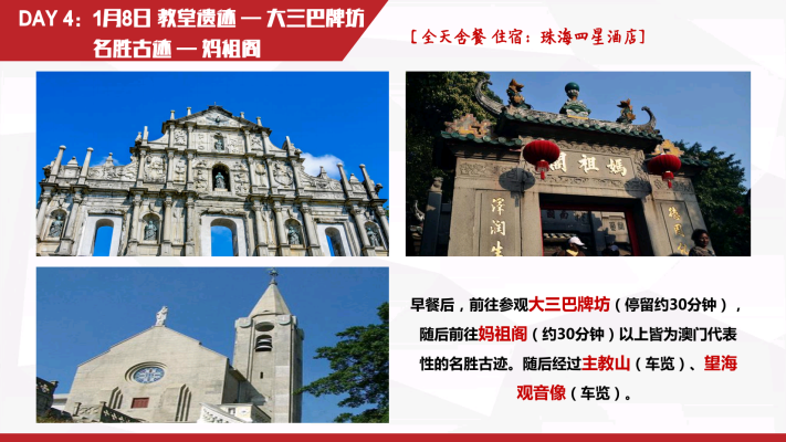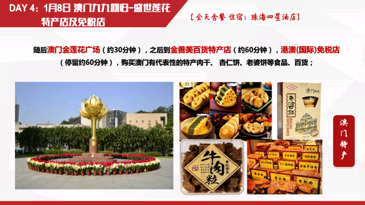 深圳~香港(金紫荆广场~会展中心~立法会大楼~中国银行~外观礼宾府~特区政府总部~市区酒楼用餐~浅水湾~太平山~香港维多利亚港~兰桂坊~黄大仙~珠宝展示中心~国际手表店~百货免税店~国际免税商店DFS)~澳门(香港码头坐喷射式飞船~澳门酒店~大三巴牌坊~妈祖阁~主教山~望海观音~金莲花广场~金善美百货特产店~港澳国际免税店~威尼斯人酒店)~珠海渔女像~情侣路~金湾机场回各自温馨的家