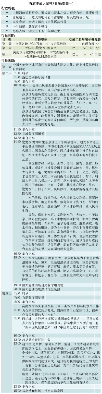 石家庄成人团建3日游(套餐一) Zoom Name:ShenZhen Zavl Import & Export Co., Ltd Name:石家庄成人团建3日游(套餐一) Model:ZT-2023省外-00018 Price: Brief:山川河流遥相呼应,形成高山流水之势,顺应自然,健康旅行 劳逸结合,天然大氧吧内看千古绝唱,品民族特色小吃 一叶快艇,载你古今畅游 Details